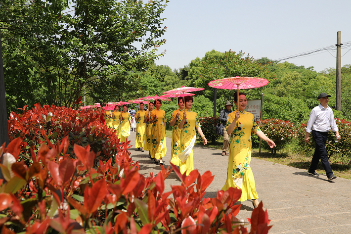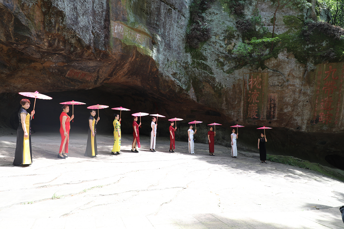 5月1日,旗袍爱好者在浮山风景区进行展示。当天,浮山风景区举办“山浮水面水浮山、百人旗袍秀浮山”活动,吸引百名旗袍爱好者走进景区秀美丽。她们撑一把柔情万种的油纸伞,着一袭黑色的旗袍,步履优雅地在观景台上缓缓走过,传统女性端庄妩媚之美与现代女性的自信向上之美如水般袭来,尽展枞阳女子的神韵与风采。